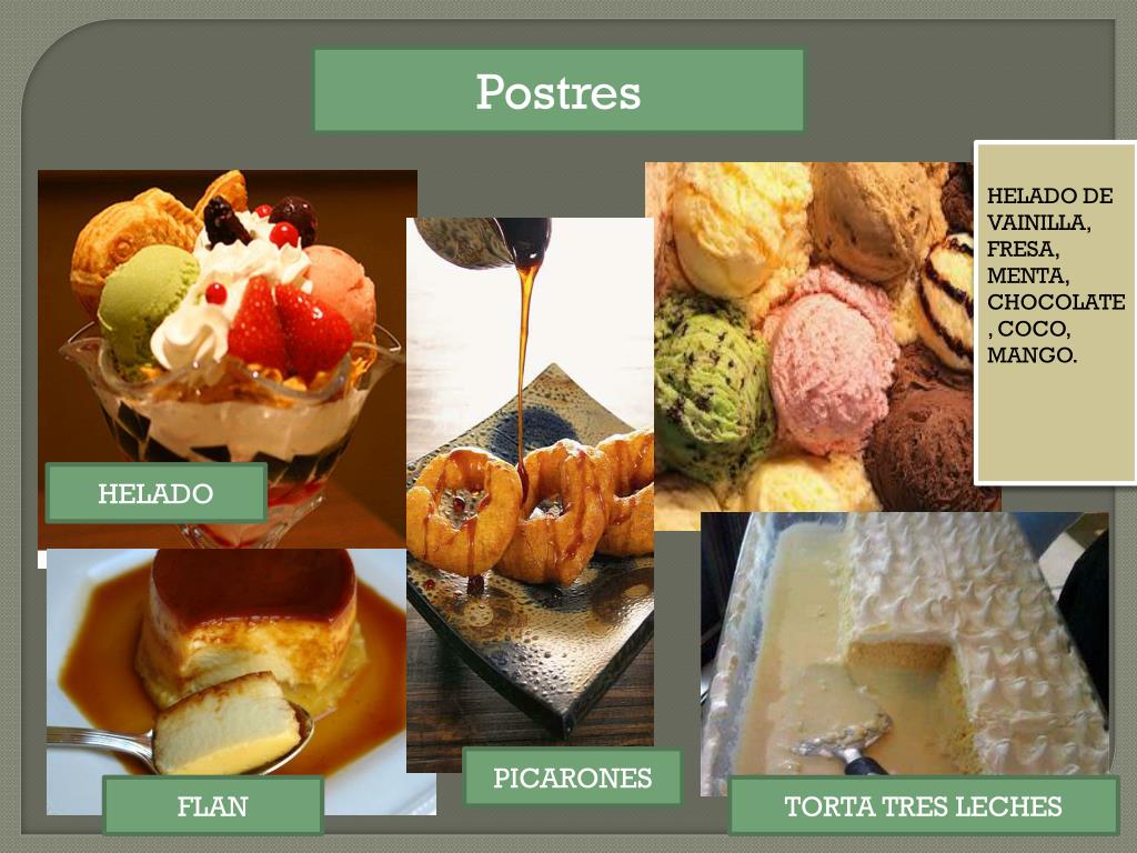 Postres HELADO DE VAINILLA, FRESA, MENTA, CHOCOLATE , COCO, MANGO. HELADO PICARONES FLAN TORTA TRES LECHES