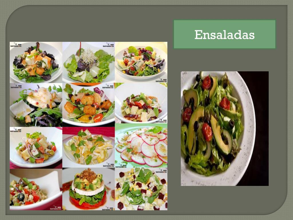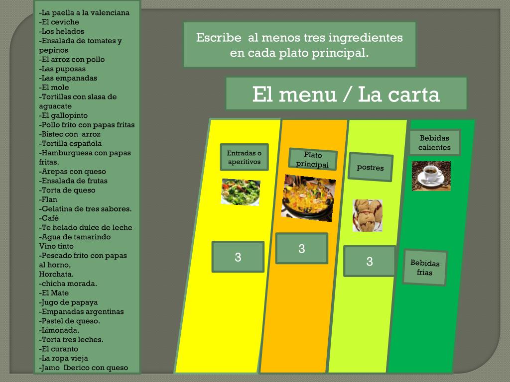 - -La paella a la valenciana -El ceviche -Los helados -Ensalada de tomates y pepinos -El arroz con pollo -Las puposas -Las empanadas -El mole -Tortillas con slasa de aguacate -El gallopinto -Pollofrito con papas fritas -Bistec con arroz -Tortilla española -Hamburguesa con papas fritas. -Arepas con queso -Ensalada de frutas -Torta de queso -Flan -Gelatina de tressabores. -Café -Te heladodulce de leche -Agua de tamarindo Vinotinto -Pescadofrito con papas al horno, Horchata. -chichamorada. -El Mate -Jugo de papaya -Empanadas argentinas -Pastel de queso. -Limonada. -Tortatresleches. -El curanto -La ropavieja -JamoIberico con queso Escribe al menostresingredientes en cadaplato principal. El menu / La carta Bebidascalientes Entradas o aperitivos Plato principal postres 3 3 3 Bebidasfrias