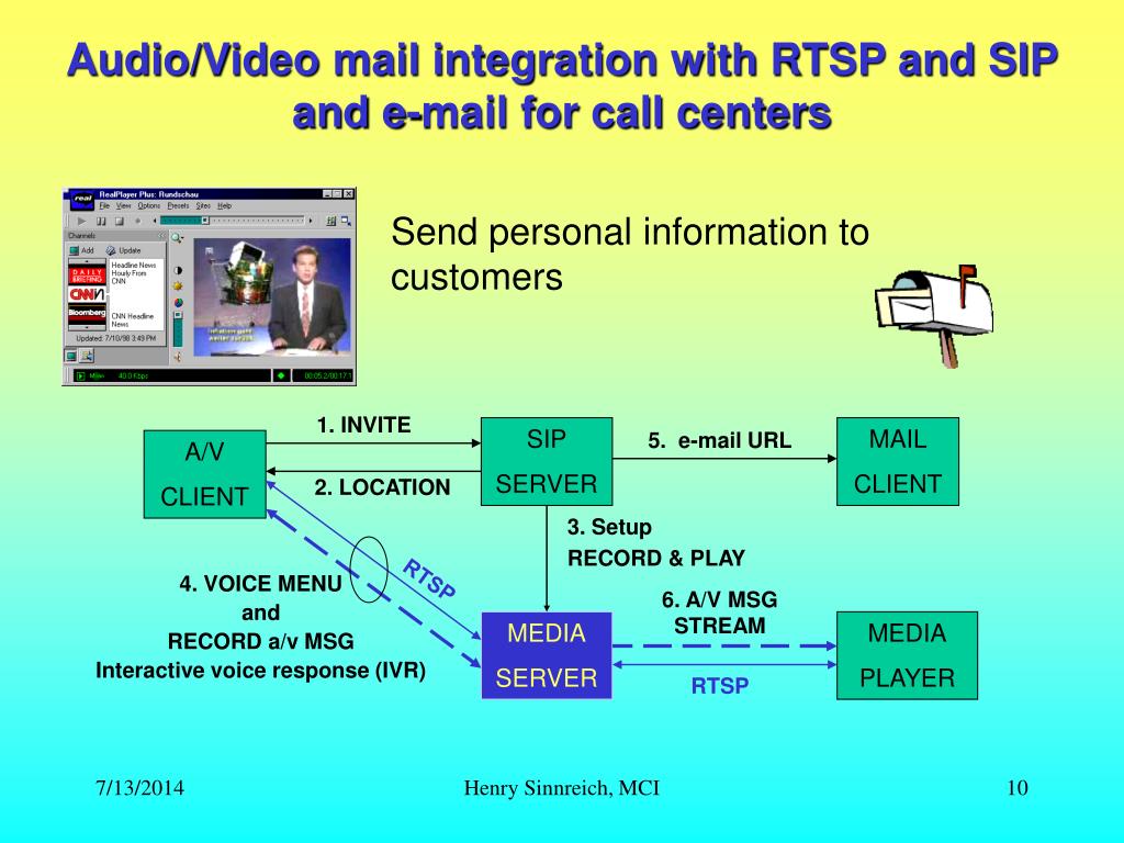 Audio/Video mail integration with RTSP and SIPand e-mail for call centers Send personal information to customers 1. INVITE SIP SERVER MAIL CLIENT 5. e-mail URL A/V CLIENT 2. LOCATION 3. Setup RECORD & PLAY RTSP 4. VOICE MENU and RECORD a/v MSG Interactive voice response (IVR) 6. A/V MSG STREAM MEDIA SERVER MEDIA PLAYER RTSP Henry Sinnreich, MCI