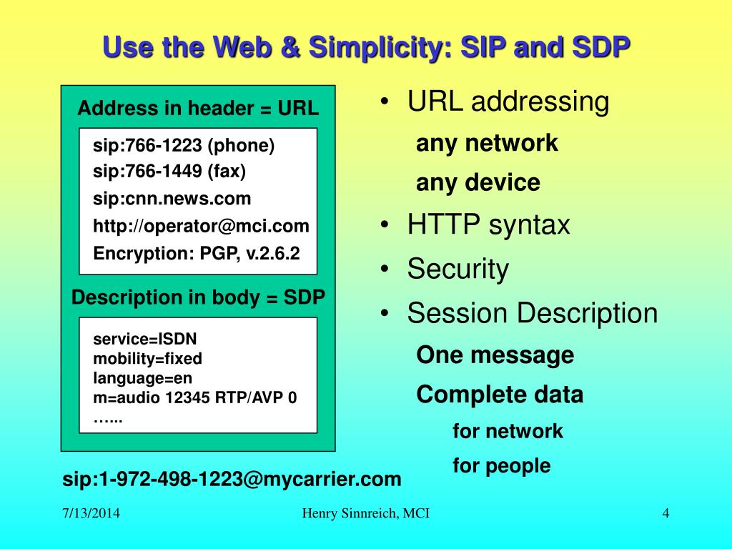 URL addressing any network any device HTTP syntax Security Session Description One message Complete data for network for people Address in header = URL sip:766-1223 (phone) sip:766-1449 (fax) sip:cnn.news.com http://operator@mci.com Encryption: PGP, v.2.6.2 Description in body = SDP service=ISDN mobility=fixed language=en m=audio 12345 RTP/AVP 0 …... Use the Web & Simplicity: SIP and SDP sip:1-972-498-1223@mycarrier.com Henry Sinnreich, MCI