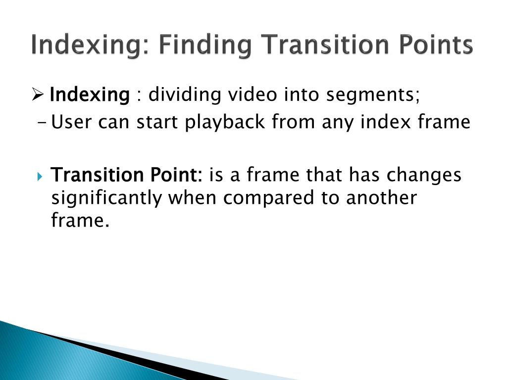 Indexing: Finding Transition Points • Indexing : dividing video into segments; • User can start playback from any index frame • Transition Point: is a frame that has changes significantly when compared to another frame.