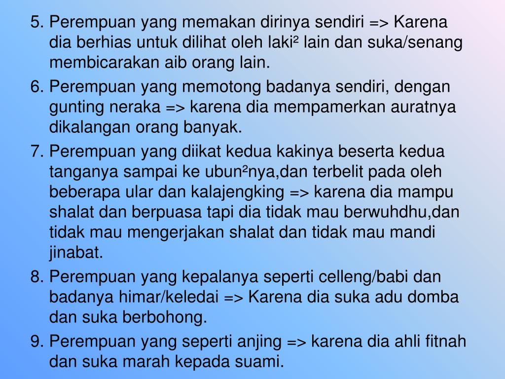5. Perempuan yang memakan dirinya sendiri => Karena dia berhias untuk dilihat oleh laki² lain dan suka/senang membicarakan aib orang lain. 6. Perempuan yang memotong badanya sendiri, dengan gunting neraka => karena dia mempamerkan auratnya dikalangan orang banyak. 7. Perempuan yang diikat kedua kakinya beserta kedua tanganya sampai ke ubun²nya,dan terbelit pada oleh beberapa ular dan kalajengking => karena dia mampu shalat dan berpuasa tapi dia tidak mau berwuhdhu,dan tidak mau mengerjakan shalat dan tidak mau mandi jinabat. 8. Perempuan yang kepalanya seperti celleng/babi dan badanya himar/keledai => Karena dia suka adu domba dan suka berbohong. 9. Perempuan yang seperti anjing => karena dia ahli fitnah dan suka marah kepada suami.