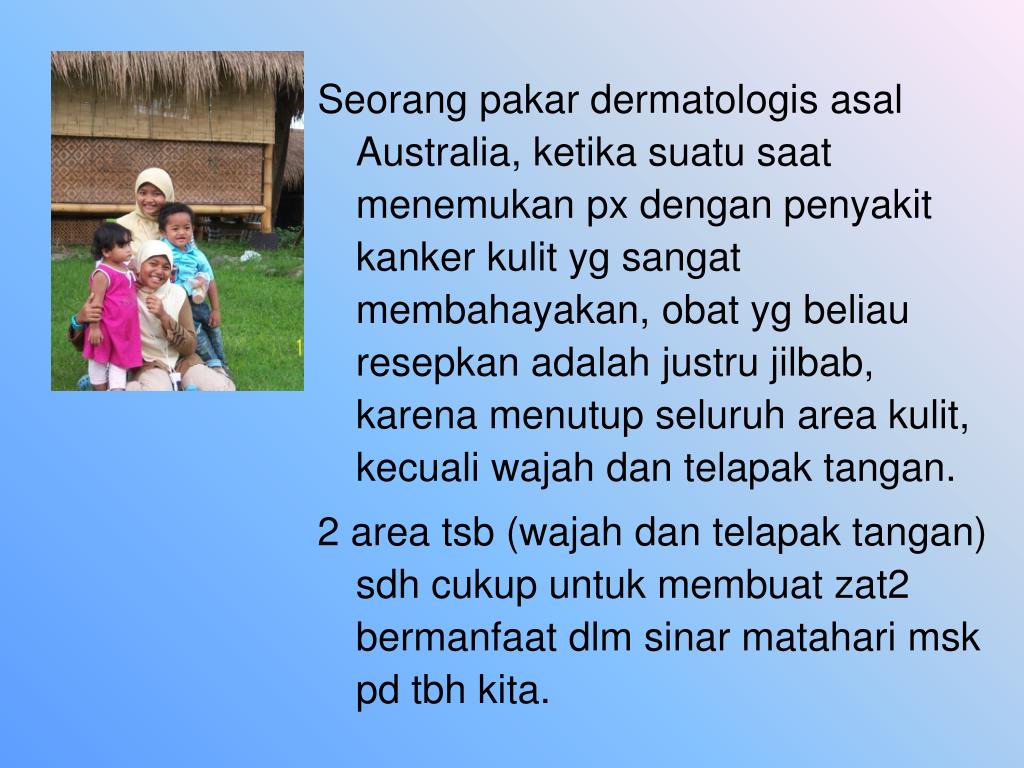 Seorang pakar dermatologis asal Australia, ketika suatu saat menemukan px dengan penyakit kanker kulit yg sangat membahayakan, obat yg beliau resepkan adalah justru jilbab, karena menutup seluruh area kulit, kecuali wajah dan telapak tangan. 2 area tsb (wajah dan telapak tangan) sdh cukup untuk membuat zat2 bermanfaat dlm sinar matahari msk pd tbh kita.