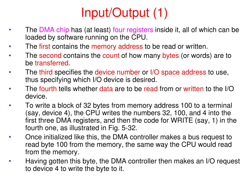 Input/Output (1) • The DMAchip has (at least) four registers inside it, all of which can be loaded by software running on the CPU. • The first contains the memory address to be read or written. • The second contains the count of how many bytes (or words) are to be transferred. • The third specifies the devicenumber or I/O space address to use, thus specifying which I/O device is desired. • The fourth tells whether data are to be read from or written to the I/O device. • To write a block of 32 bytes from memory address 100 to a terminal (say, device 4), the CPU writes the numbers 32, 100, and 4 into the first three DMA registers, and then the code for WRITE (say, 1) in the fourth one, as illustrated in Fig. 5-32. • Once initialized like this, the DMA controller makes a bus request to read byte 100 from the memory, the same way the CPU would read from the memory. • Having gotten this byte, the DMA controller then makes an I/O request to device 4 to write the byte to it.