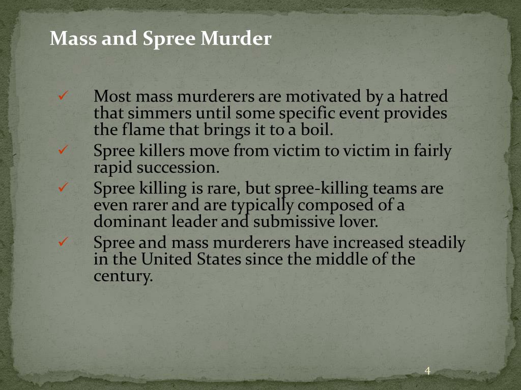 Mass and Spree Murder • Most mass murderers are motivated by a hatred that simmers until some specific event provides the flame that brings it to a boil. • Spree killers move from victim to victim in fairly rapid succession. • Spree killing is rare, but spree-killing teams are even rarer and are typically composed of a dominant leader and submissive lover. • Spree and mass murderers have increased steadily in the United States since the middle of the century.