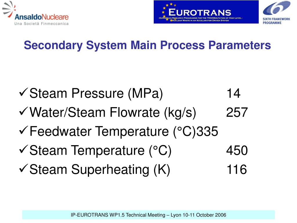 Secondary System Main Process Parameters • Steam Pressure (MPa) 14 • Water/Steam Flowrate (kg/s) 257 • Feedwater Temperature (°C) 335 • Steam Temperature (°C) 450 • Steam Superheating (K) 116