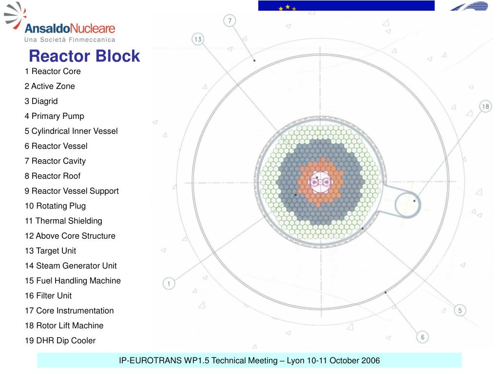 Reactor Block 1 Reactor Core 2 Active Zone 3 Diagrid 4 Primary Pump 5 Cylindrical Inner Vessel 6 Reactor Vessel 7 Reactor Cavity 8 Reactor Roof 9 Reactor Vessel Support 10 Rotating Plug 11 Thermal Shielding 12 Above Core Structure 13 Target Unit 14 Steam Generator Unit 15 Fuel Handling Machine 16 Filter Unit 17 Core Instrumentation 18 Rotor Lift Machine 19 DHR Dip Cooler