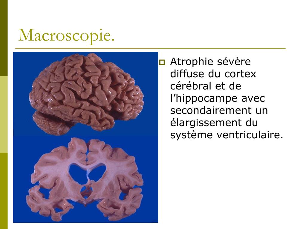 Examen autopsique. • Cerveau : • Atrophie corticale diffuse avec des sillons plus marqués. • Élargissement secondaire du système ventriculaire. • Atrophie de l’hippocampe.