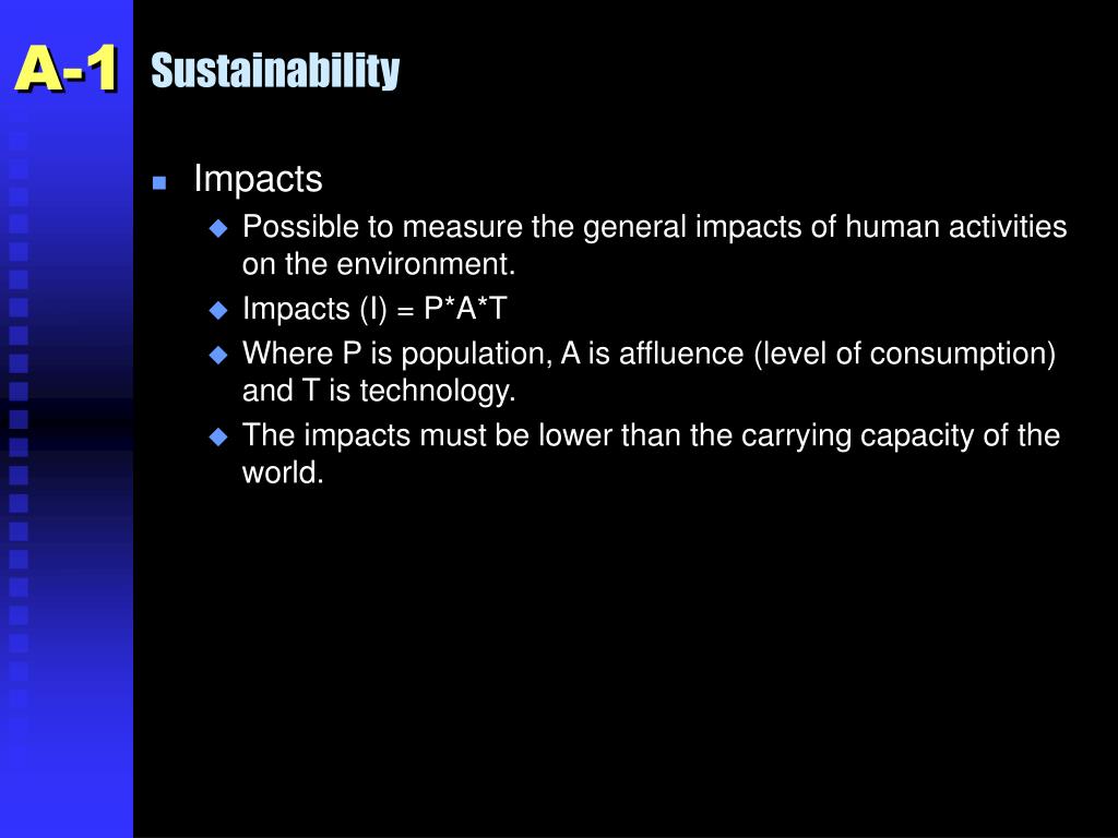 Sustainability A-1 • Impacts • Possible to measure the general impacts of human activities on the environment. • Impacts (I) = P*A*T • Where P is population, A is affluence (level of consumption) and T is technology. • The impacts must be lower than the carrying capacity of the world.