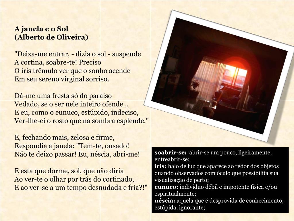 A janela e o Sol (Alberto de Oliveira) "Deixa-me entrar, - dizia o sol - suspende A cortina, soabre-te! Preciso O íris trêmulo ver que o sonho acende Em seu sereno virginal sorriso. Dá-me uma fresta só do paraíso Vedado, se o ser nele inteiro ofende... E eu, como o eunuco, estúpido, indeciso, Ver-lhe-ei o rosto que na sombra esplende." E, fechando mais, zelosa e firme, Respondia a janela: "Tem-te, ousado! Não te deixo passar! Eu, néscia, abri-me! E esta que dorme, sol, que não diria Ao ver-te o olhar por trás do cortinado, E ao ver-se a um tempo desnudada e fria?!" soabrir-se: abrir-se um pouco, ligeiramente, entreabrir-se; íris: halo de luz que aparece ao redor dos objetos quando observados com óculo que possibilita sua visualização de perto; eunuco: indivíduo débil e impotente física e/ou espiritualmente; néscia: aquela que é desprovida de conhecimento, estúpida, ignorante;