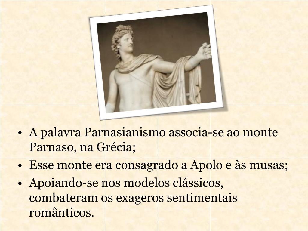 A palavra Parnasianismo associa-se ao monte Parnaso, na Grécia; • Esse monte era consagrado a Apolo e às musas; • Apoiando-se nos modelos clássicos, combateram os exageros sentimentais românticos.