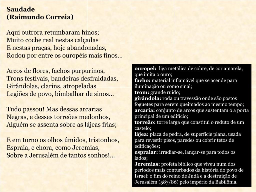 Saudade (Raimundo Correia) Aqui outrora retumbaram hinos; Muito coche real nestas calçadas E nestas praças, hoje abandonadas, Rodou por entre os ouropéis mais finos... Arcos de flores, fachos purpurinos, Trons festivais, bandeiras desfraldadas, Girândolas, clarins, atropeladas Legiões de povo, bimbalhar de sinos... Tudo passou! Mas dessas arcarias Negras, e desses torreões medonhos, Alguém se assenta sobre as lájeas frias; E em torno os olhos úmidos, tristonhos, Espraia, e chora, como Jeremias, Sobre a Jerusalém de tantos sonhos!... ouropel: liga metálica de cobre, de cor amarela, que imita o ouro; facho: material inflamável que se acende para iluminação ou como sinal; trom: grande ruído; girândola: roda ou travessão onde são postos foguetes para serem queimados ao mesmo tempo; arcaria: conjunto de arcos que sustentam o a porta principal de um edifício; torreão: torre larga que constitui o reduto de um castelo; lájea: placa de pedra, de superfície plana, usada para revestir pisos, paredes ou cobrir tetos de edificações; espraiar: irradiar-se, lançar-se para todos os lados; Jeremias: profeta bíblico que viveu num dos períodos mais conturbados da história do povo de Israel: o fim do reino de Judá e a destruição de Jerusalém (587/86) pelo império da Babilônia.