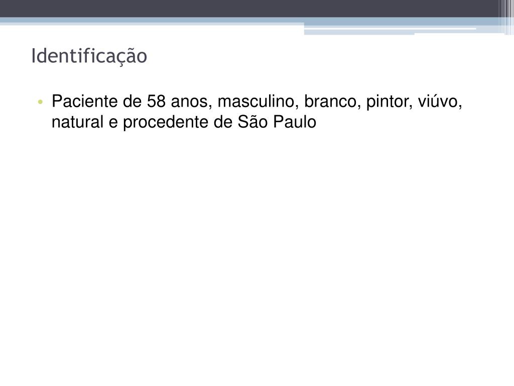 Identificação • Paciente de 58 anos, masculino, branco, pintor, viúvo, natural e procedente de São Paulo