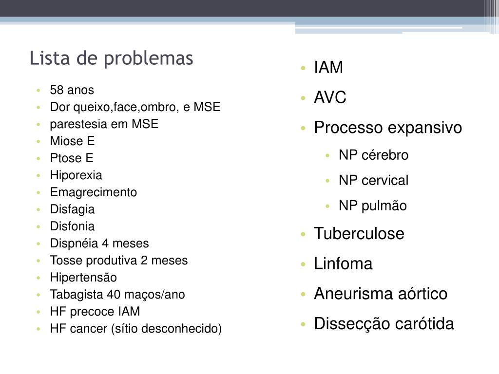 Lista de problemas • IAM • AVC • Processo expansivo • NP cérebro • NP cervical • NP pulmão • Tuberculose • Linfoma • Aneurisma aórtico • Dissecção carótida • 58 anos • Dor queixo,face,ombro, e MSE • parestesia em MSE • Miose E • Ptose E • Hiporexia • Emagrecimento • Disfagia • Disfonia • Dispnéia 4 meses • Tosse produtiva 2 meses • Hipertensão • Tabagista 40 maços/ano • HF precoce IAM • HF cancer (sítio desconhecido)
