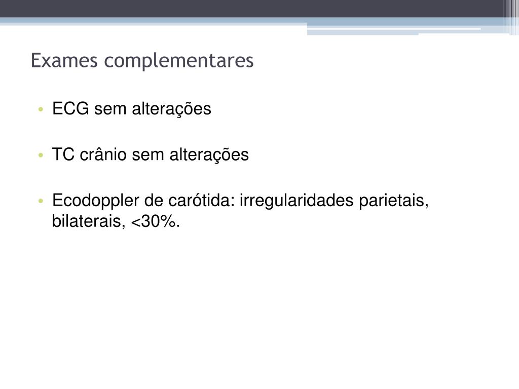 Exames complementares • ECG sem alterações • TC crânio sem alterações • Ecodoppler de carótida: irregularidades parietais, bilaterais, <30%.