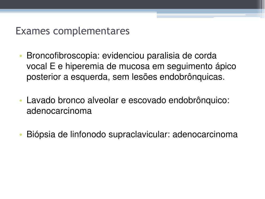 Exames complementares • Broncofibroscopia: evidenciou paralisia de corda vocal E ehiperemia de mucosa em seguimento ápico posterior a esquerda, sem lesões endobrônquicas. • Lavado bronco alveolar e escovado endobrônquico: adenocarcinoma • Biópsia de linfonodosupraclavicular: adenocarcinoma