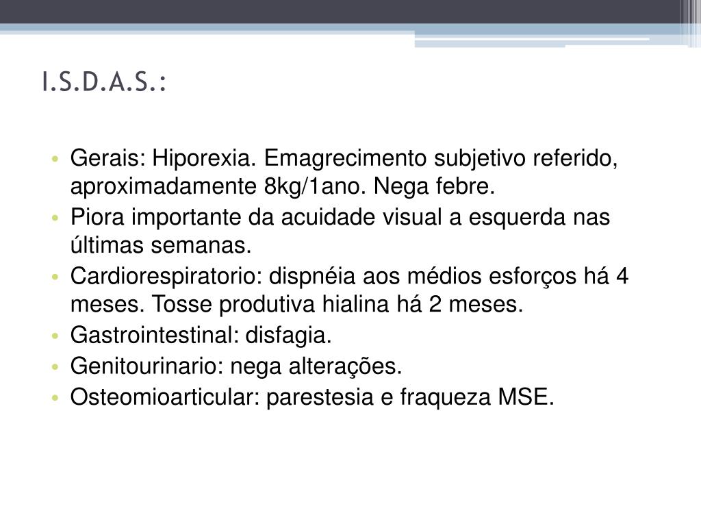 I.S.D.A.S.: • Gerais: Hiporexia. Emagrecimento subjetivo referido, aproximadamente 8kg/1ano. Nega febre. • Piora importante da acuidade visual a esquerda nas últimas semanas. • Cardiorespiratorio: dispnéia aos médios esforços há 4 meses. Tosse produtiva hialina há 2 meses. • Gastrointestinal: disfagia. • Genitourinario: nega alterações. • Osteomioarticular: parestesia e fraqueza MSE.
