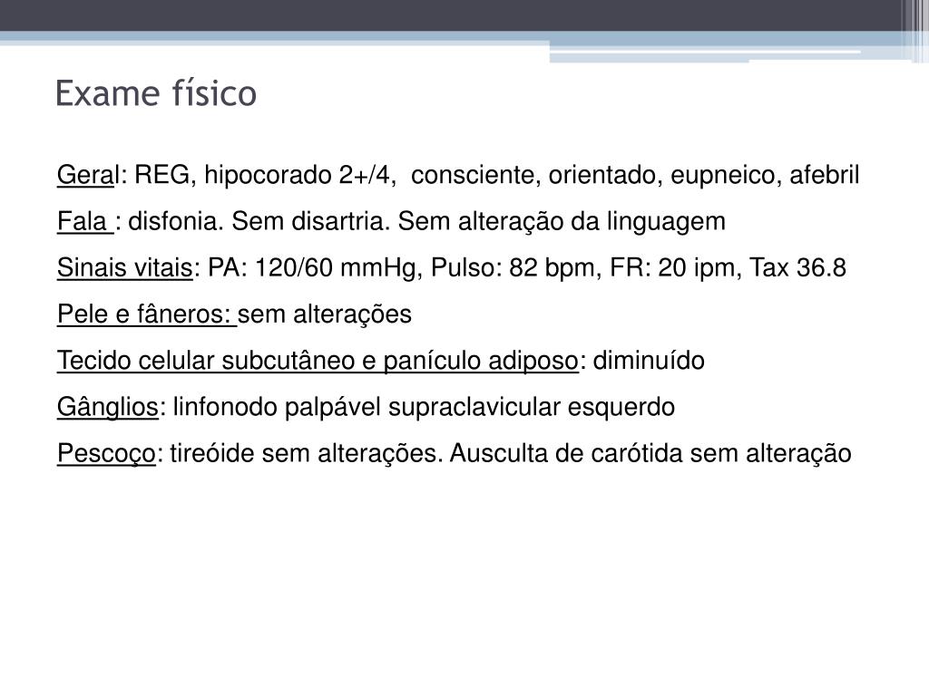 Exame físico Geral:REG, hipocorado 2+/4, consciente, orientado, eupneico, afebril Fala : disfonia. Sem disartria. Sem alteração da linguagem Sinais vitais: PA: 120/60 mmHg, Pulso: 82 bpm, FR: 20 ipm, Tax 36.8 Pele e fâneros: sem alterações Tecido celular subcutâneo e panículo adiposo: diminuído Gânglios: linfonodo palpável supraclavicular esquerdo Pescoço: tireóide sem alterações. Ausculta de carótida sem alteração