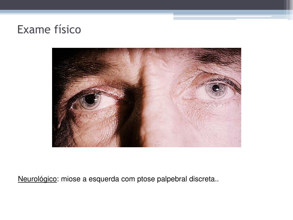 Exame físico Neurológico: miose a esquerda com ptose palpebral discreta..