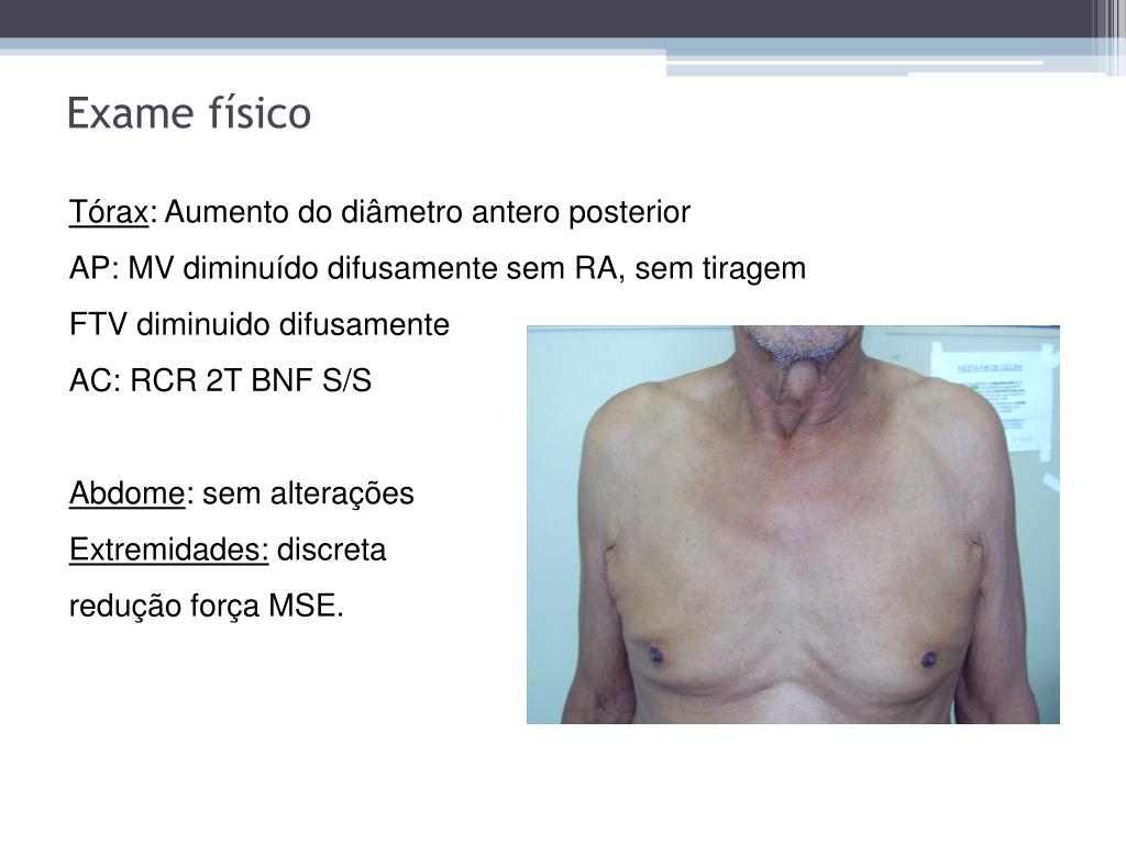 Exame físico Tórax: Aumento do diâmetro antero posterior AP: MV diminuído difusamente sem RA, sem tiragem FTV diminuido difusamente AC: RCR 2T BNF S/S Abdome: sem alterações Extremidades: discreta redução força MSE.