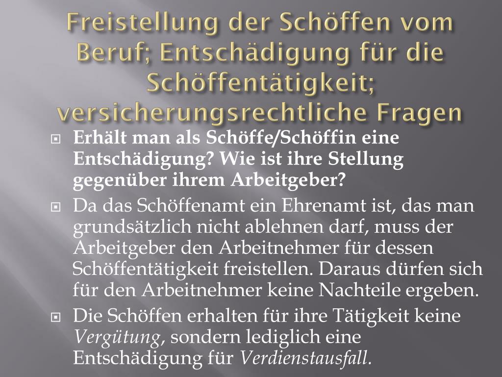 FreistellungderSchöffenvomBeruf; Entschädigungfür die Schöffentätigkeit; versicherungsrechtlicheFragen • Erhält man alsSchöffe/SchöffineineEntschädigung? WieistihreStellunggegenüberihremArbeitgeber? • Da das SchöffenamteinEhrenamtist, das man grundsätzlichnichtablehnendarf, muss derArbeitgeber den ArbeitnehmerfürdessenSchöffentätigkeitfreistellen. Darausdürfensichfür den ArbeitnehmerkeineNachteileergeben. • Die SchöffenerhaltenfürihreTätigkeitkeineVergütung, sondernlediglicheineEntschädigungfürVerdienstausfall.