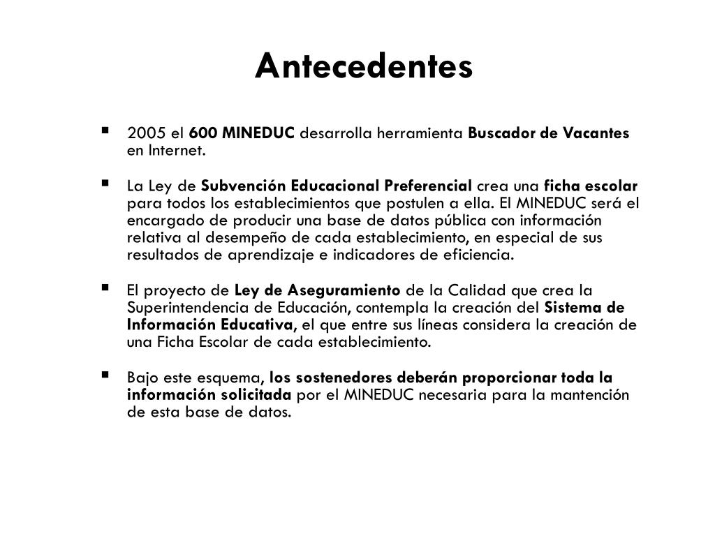 Antecedentes • 2005 el 600 MINEDUC desarrolla herramienta Buscador de Vacantes en Internet. • La Ley de Subvención Educacional Preferencial crea una ficha escolar para todos los establecimientos que postulen a ella. El MINEDUC será el encargado de producir una base de datos pública con información relativa al desempeño de cada establecimiento, en especial de sus resultados de aprendizaje e indicadores de eficiencia. • El proyecto de Ley de Aseguramiento de la Calidad que crea la Superintendencia de Educación, contempla la creación del Sistema de Información Educativa, el que entre sus líneas considera la creación de una Ficha Escolar de cada establecimiento. • Bajo este esquema, los sostenedores deberán proporcionar toda la información solicitada por el MINEDUC necesaria para la mantención de esta base de datos.