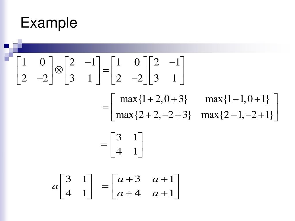 Commutativity Associativity: Distribution of addition over multiplication Null element Basic Properties of Max-Plus Algebra For example let η= -∞