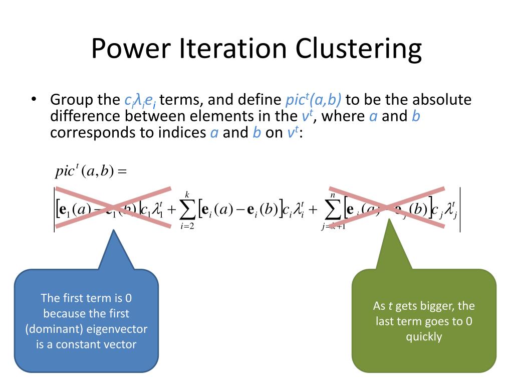 Power Iteration Clustering • Group the ciλieiterms, and define pict(a,b)to be the absolute difference between elements in the vt, where a and b corresponds to indices a and b on vt: The first term is 0 because the first (dominant) eigenvector is a constant vector As t gets bigger, the last term goes to 0 quickly