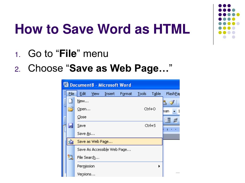 How to Save Word as HTML • Go to “File” menu • Choose “Save as Web Page…”