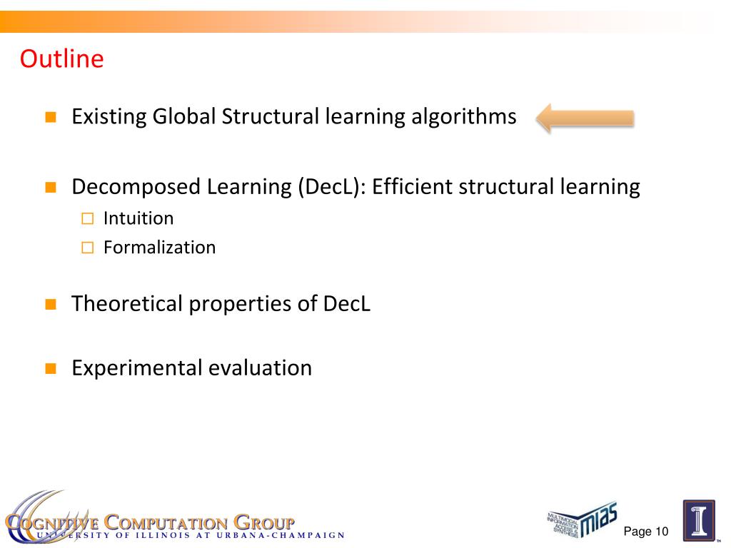 Outline • Existing Structural learning algorithms • Decomposed Learning (DecL): Efficient structural learning • Intuition • Formalization • Theoretical properties of DecL • Experimental evaluation