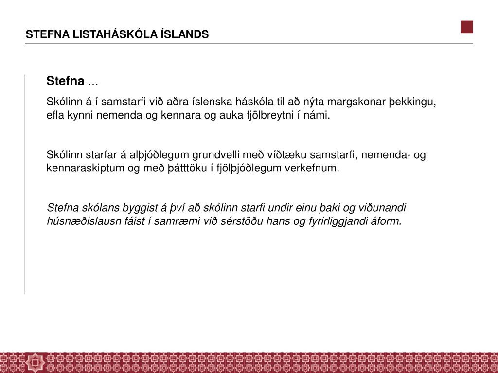 STEFNA … STEFNA LISTAHÁSKÓLA ÍSLANDS Stefna 2 Stefna … Skólinn nýtir ávinninginn af sambýli ólíkra listgreina til að tengja nemendur og kennara í verkefnum. Skólinn beitir sér fyrir framförum á sviði lista, tekur frumkvæði í umræðu um mennta- og menningarmál, setur upp sýningar og margvíslega listviðburði sem opnir eru almenningi og á samstarf við stofnanir, félög og einstaklinga um allt land. Skólinn leggur áherslu á að akademískir starfsmenn hans séu starfandi listamenn eða fræðimenn og að sköpuð verði öflug tengsl við atvinnu- og listalíf. Skólinn miðlar upplýsingum og þekkingu um listir og menningu til almennings og gefur starfandi listafólki tækifæri til að bæta við og endurnýja þekkingu sína. MOTTÓ: SKÖPUN MIÐLUN FRÆÐSLA MIÐLUN – MARGAR LISTGREINAR – FÁIR NEMENUR – UNGT STARFSFÓLK – PERSÓNULEGUR SKÓLI FÆÐSLA