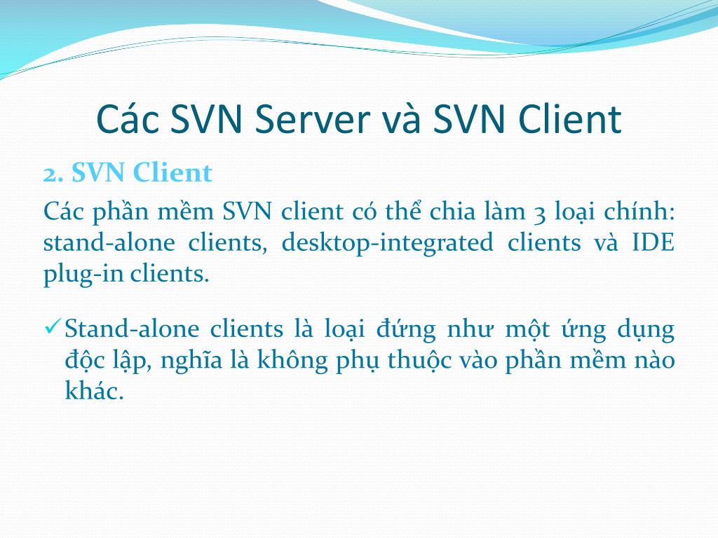 Các SVN Server và SVN Client 2. SVN Client CácphầnmềmSVN client cóthể chia làm 3 loạichính: stand-alone clients, desktop-integrated clients và IDE plug-in clients. • Stand-alone clients làloạiđứngnhưmộtứngdụngđộclập, nghĩalàkhôngphụthuộcvàophầnmềmnàokhác.
