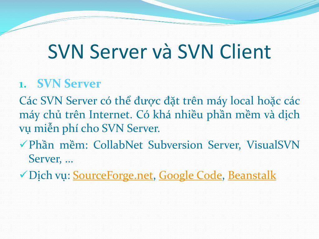 SVN Server vàSVN Client • SVN Server Các SVN Server cóthểđượcđặttrênmáy local hoặccácmáychủtrên Internet. Cókhánhiềuphầnmềmvàdịchvụmiễnphícho SVN Server. • Phầnmềm: CollabNet Subversion Server, VisualSVN Server, … • Dịchvụ: SourceForge.net, Google Code, Beanstalk