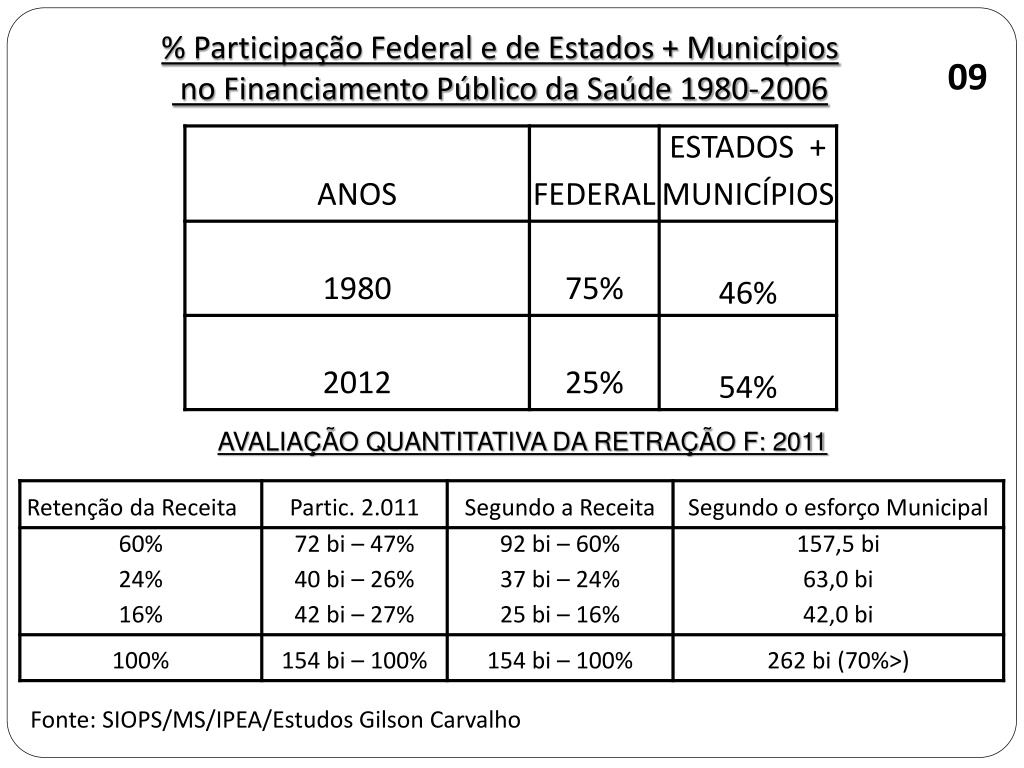 % Participação Federal e de Estados + Municípios no Financiamento Público da Saúde 1980-2006 09 AVALIAÇÃO QUANTITATIVA DA RETRAÇÃO F: 2011 Fonte: SIOPS/MS/IPEA/Estudos Gilson Carvalho
