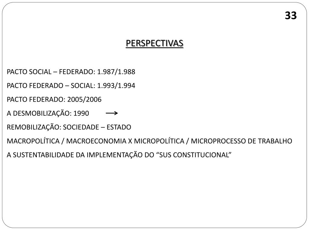 33 PERSPECTIVAS PACTO SOCIAL – FEDERADO: 1.987/1.988 PACTO FEDERADO – SOCIAL: 1.993/1.994 PACTO FEDERADO: 2005/2006 A DESMOBILIZAÇÃO: 1990 REMOBILIZAÇÃO: SOCIEDADE – ESTADO MACROPOLÍTICA / MACROECONOMIA X MICROPOLÍTICA / MICROPROCESSO DE TRABALHO A SUSTENTABILIDADE DA IMPLEMENTAÇÃO DO “SUS CONSTITUCIONAL”