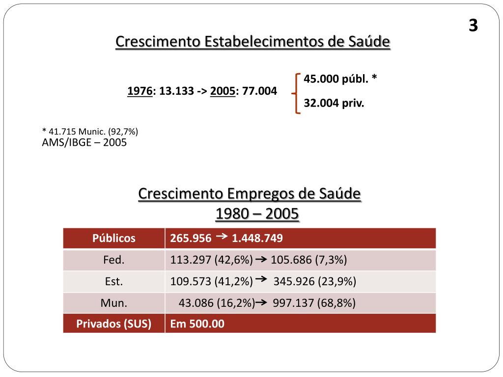 3 Crescimento Estabelecimentos de Saúde 45.000 públ. *1976: 13.133 -> 2005: 77.004 32.004 priv. * 41.715 Munic. (92,7%)AMS/IBGE – 2005 Crescimento Empregos de Saúde1980 – 2005