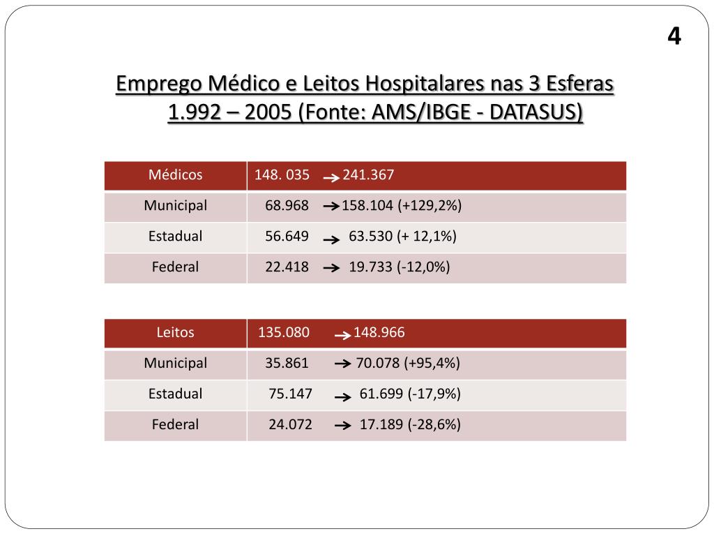 4 Emprego Médico e Leitos Hospitalares nas 3 Esferas1.992 – 2005 (Fonte: AMS/IBGE - DATASUS)