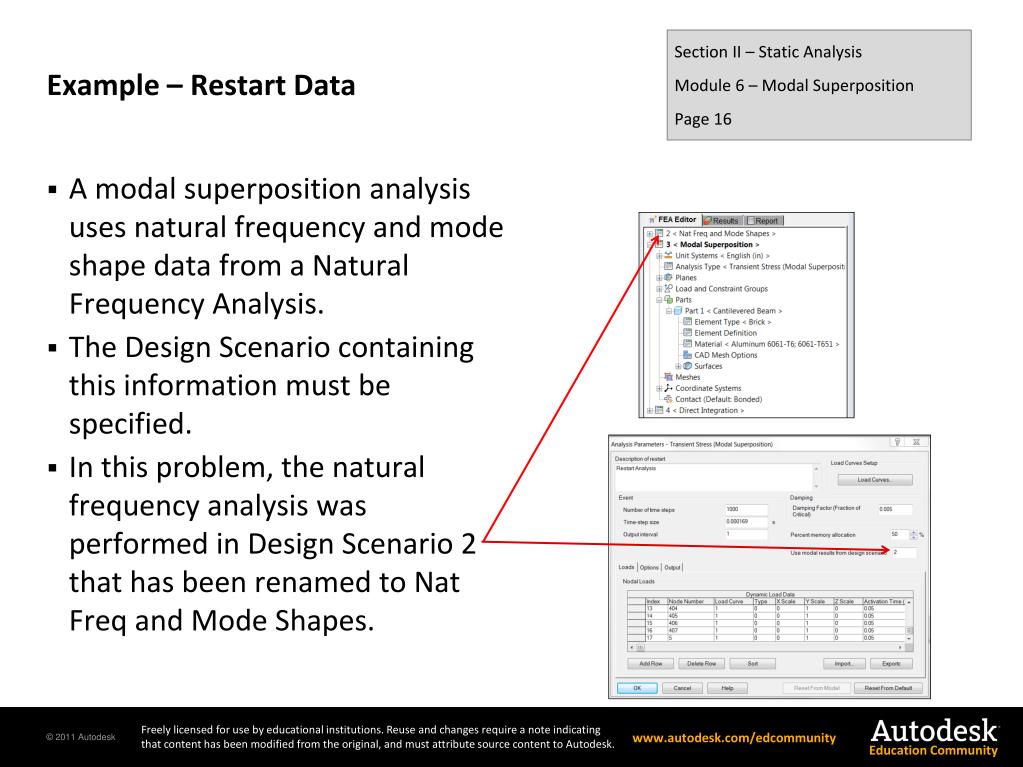 Example – Restart Data Section II – Static Analysis Module 6 – Modal Superposition Page 16 • A modal superposition analysis uses natural frequency and mode shape data from a Natural Frequency Analysis. • The Design Scenario containing this information must be specified. • In this problem, the natural frequency analysis was performed in Design Scenario 2 that has been renamed to Nat Freq and Mode Shapes.