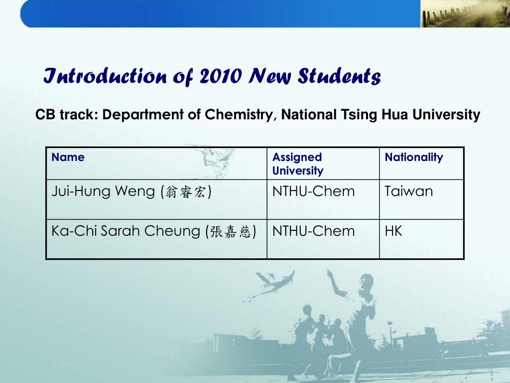 Introduction of 2010 New Students CB track:Department of Chemistry, National Tsing Hua University