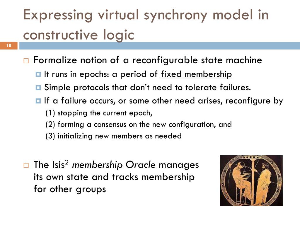 Expressing virtual synchrony model in constructive logic • Formalize notion of a reconfigurable state machine • It runs in epochs: a period of fixed membership • Simple protocols that don’t need to tolerate failures. • If a failure occurs, or some other need arises, reconfigure by (1) stopping the current epoch, (2) forming a consensus on the new configuration, and (3) initializing new members as needed • The Isis2membership Oracle manages its own state and tracks membershipfor other groups