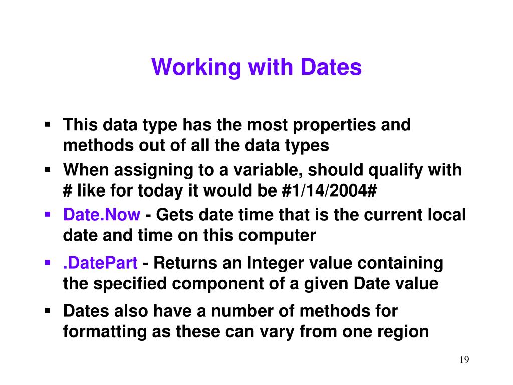 Working with Dates • This data type has the most properties and methods out of all the data types • When assigning to a variable, should qualify with # like for today it would be #1/14/2004# • Date.Now - Gets date time that is the current local date and time on this computer • .DatePart - Returns an Integer value containing the specified component of a given Date value • Dates also have a number of methods for formatting as these can vary from one region