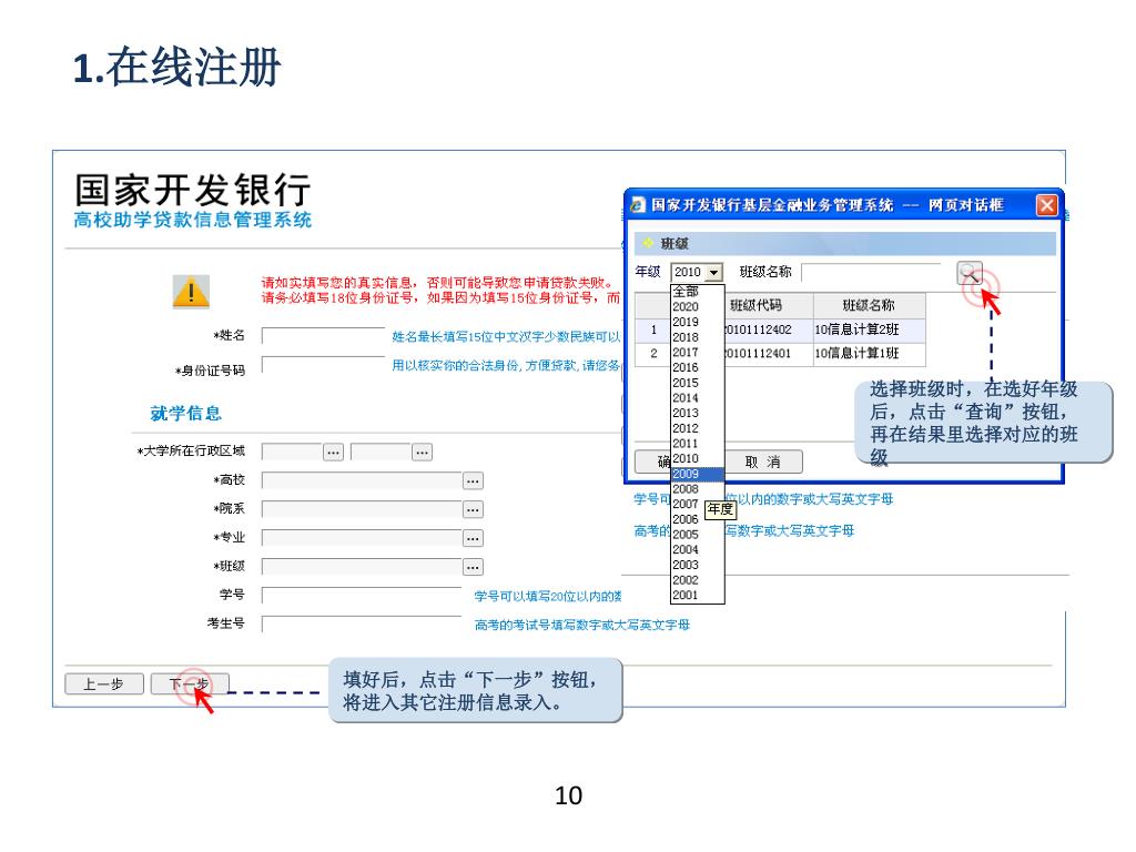 1.在线注册 选择班级时,在选好年级后,点击“查询”按钮,再在结果里选择对应的班级 填好后,点击“下一步”按钮,将进入其它注册信息录入。 10