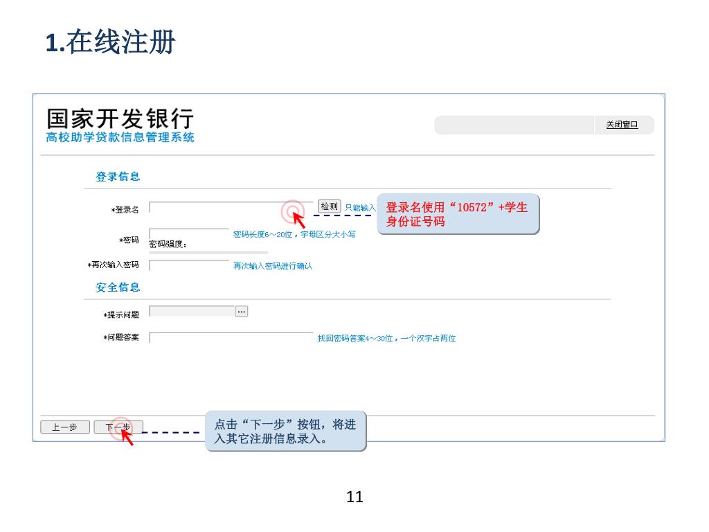 1.在线注册 登录名使用“10572”+学生身份证号码 点击“下一步”按钮,将进入其它注册信息录入。 11