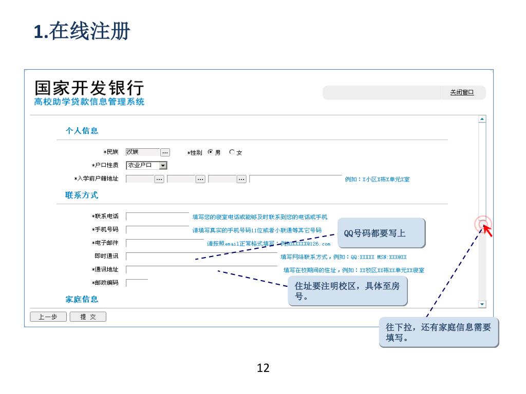 1.在线注册 QQ号码都要写上 住址要注明校区,具体至房号。 点击“下一步”按钮,进入下一输入界面。 往下拉,还有家庭信息需要填写。 12