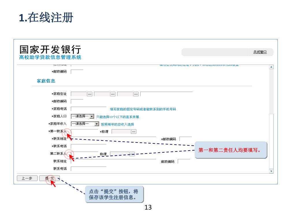 1.在线注册 第一和第二责任人均要填写。 点击“提交”按钮,将保存该学生注册信息。 13