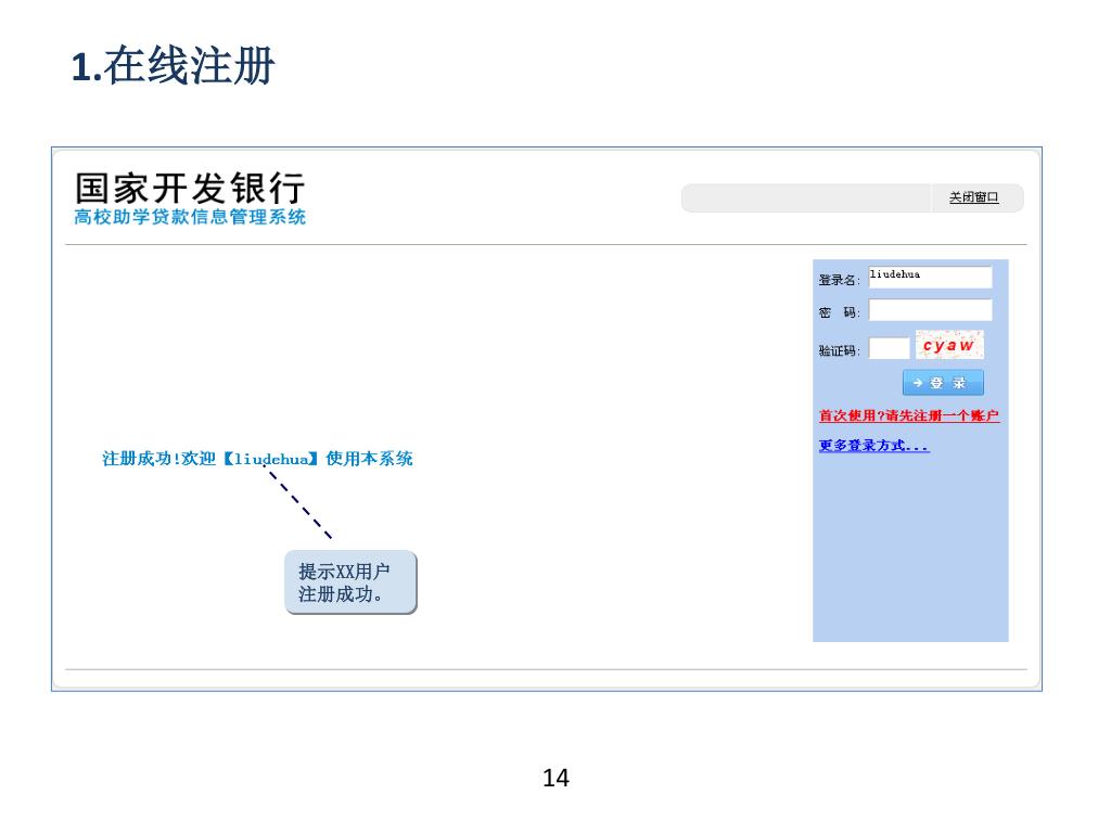 目录 5.我的首页 1.在线注册 2.登录系统 6.贷款申请流程 3.更多登录方式 7.贷款申请 4.重置密码 8.提前还款申请 9.登录信息 10.个人信息 1.在线注册 欢迎您使用本系统!您在初次贷款时需要进行注册。通过门户网站提供的注册功能进行注册。 注意:请您一定要填写真实的信息!否则贷款可能审批不通过。如果之前已获国家开发银行高校助学贷款,即不用注册。 11.我的消息 12.还款账号变更 13.贷款情况 14.还款明细 15.利息计算 16.在线咨询与投诉