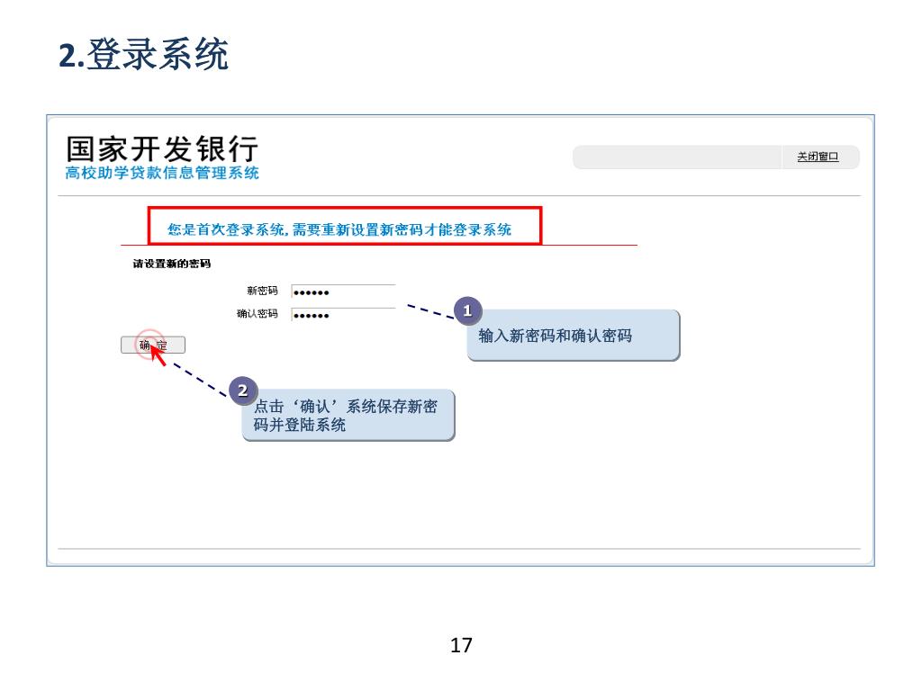 2.登录系统 1 2 输入新密码和确认密码 点击‘确认’系统保存新密码并登陆系统 17