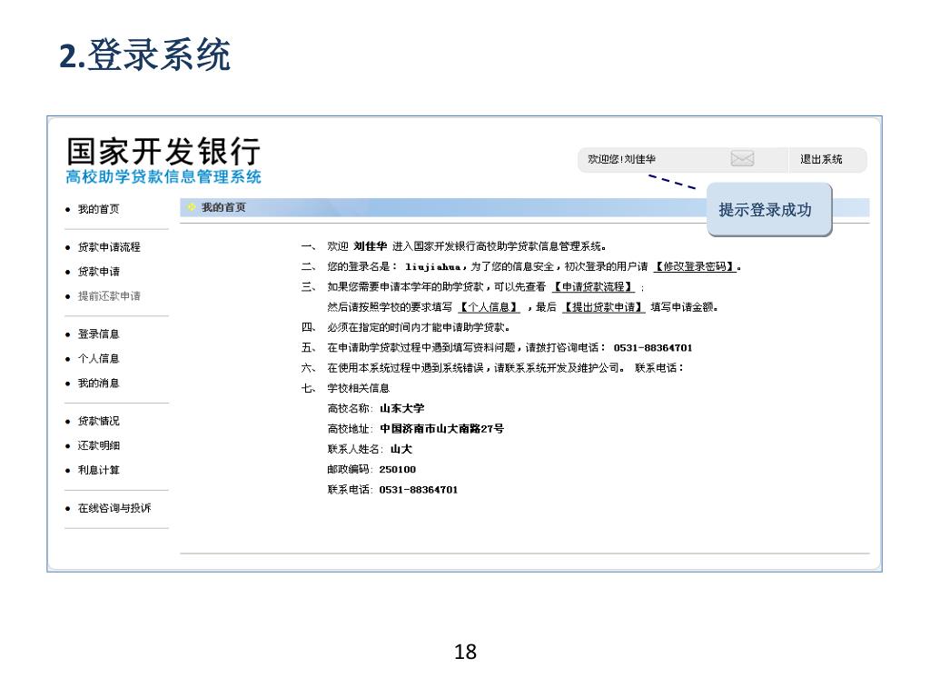 目录 1.在线注册 2.登录系统 5.我的首页 6.贷款申请流程 3.更多登录方式 7.贷款申请 4.重置密码 8.提前还款申请 9.登录信息 5.我的首页 10.个人信息 提示学生在线系统具有哪些功能,以及一些注意事项,并提供所在高校的一些联系信息。 学生登录系统成功后就可以查阅我的首页。 11.我的消息 12.贷款情况 13.还款明细 14.利息计算 15.在线咨询与投诉