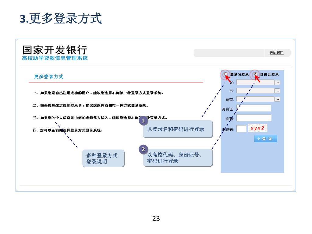 3.更多登录方式 1 2 以登录名和密码进行登录 以高校代码、身份证号、密码进行登录 多种登录方式登录说明 23