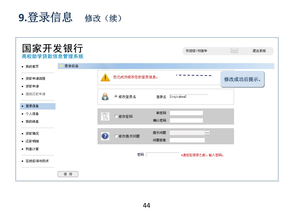 目录 1.在线注册 2.登录系统 5.我的首页 6.贷款申请流程 3.更多登录方式 7.贷款申请 4.重置密码 8.提前还款申请 9.登录信息 9.登录信息 10.个人信息 学生可以通过该功能修改登录名、密码、提示的问题及答案。 学生发现自己登录名不好,或者自己密码被别人知道了,提示的问题不合适等原因需要修改这些信息,都可以通过该功能进行重新修改设置。 。 11.我的消息 12.贷款情况 13.还款明细 14.利息计算 15.在线咨询与投诉